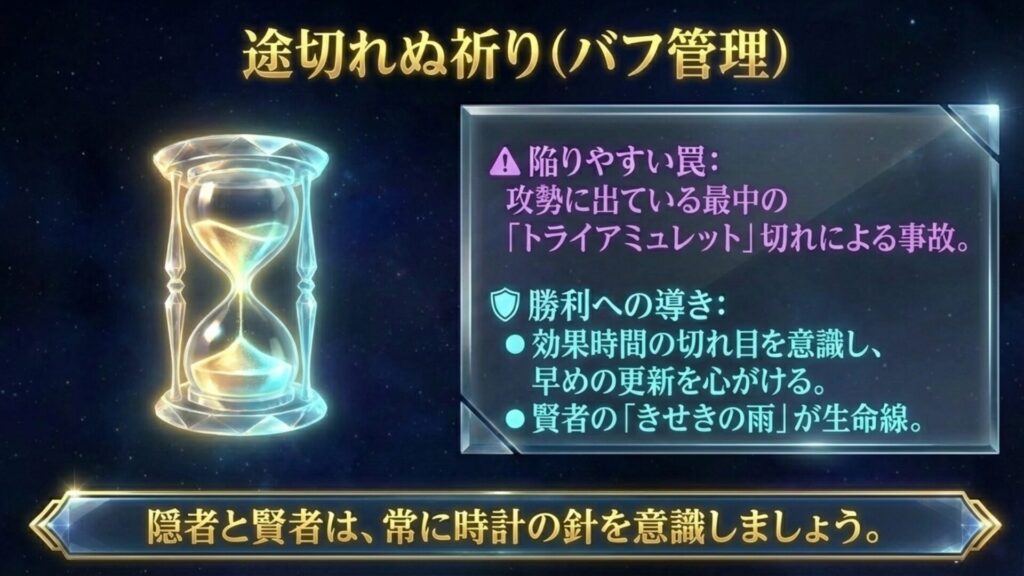 早めの更新:隠者・賢者はバフの残り時間に注目し、余裕を持って更新しましょう。
