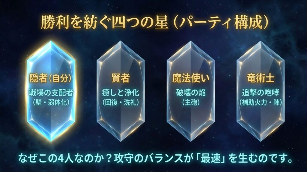 1分台という高速タイムと安全性を両立させるのが、この 「隠賢魔竜」 構成です。