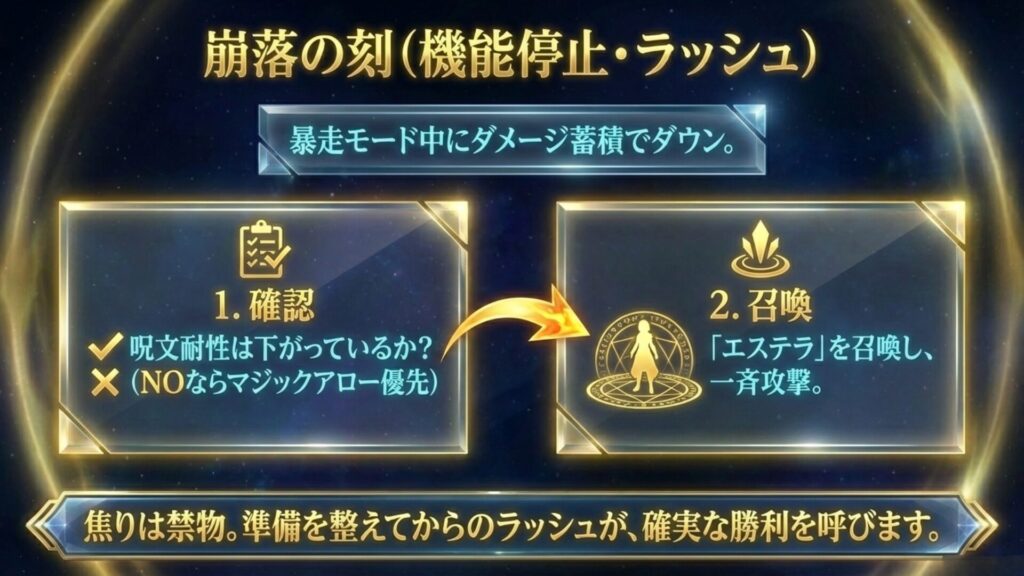 暴走モード中にダメージを蓄積させると、敵が「機能停止」してダウンします。