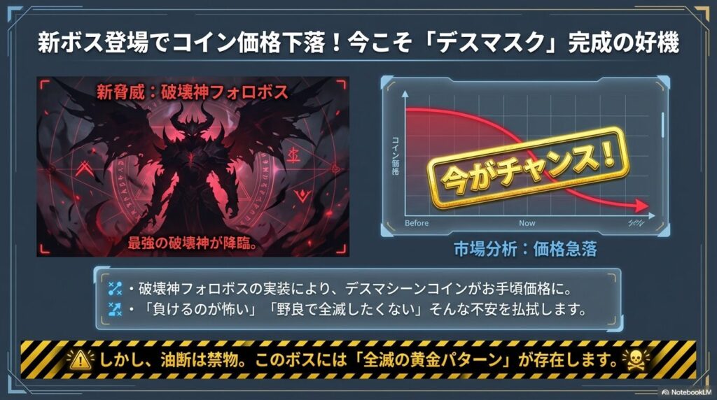 新コインボス「破壊神フォロボス」の登場で、デスマシーンのコインが2等に降格し、ぐっとお安くなりましたね。