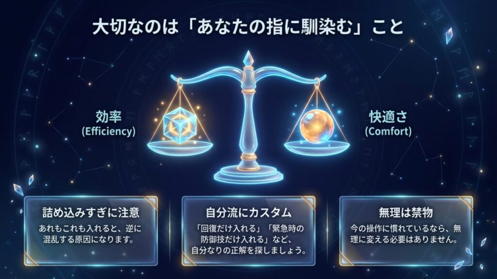 一瞬の判断が大事なバトルにおいて、自分に合った設定を見つけることはとても大切です。 もし、ツッコミ避けや緊急時の回復が間に合わなくて苦労している方がいたら、ぜひ一度試してみてください。
