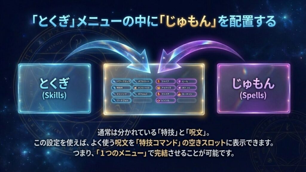 バージョン6.0から実装された機能で、特技コマンドの中に呪文を表示させることができる設定です。 これまでは「とくぎ」と「じゅもん」のメニューは完全に分かれていましたが、設定一つでよく使う呪文を特技の空き枠に埋め込むことが可能になりました。