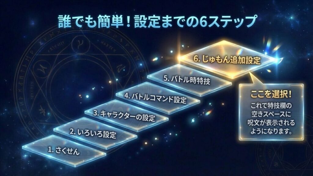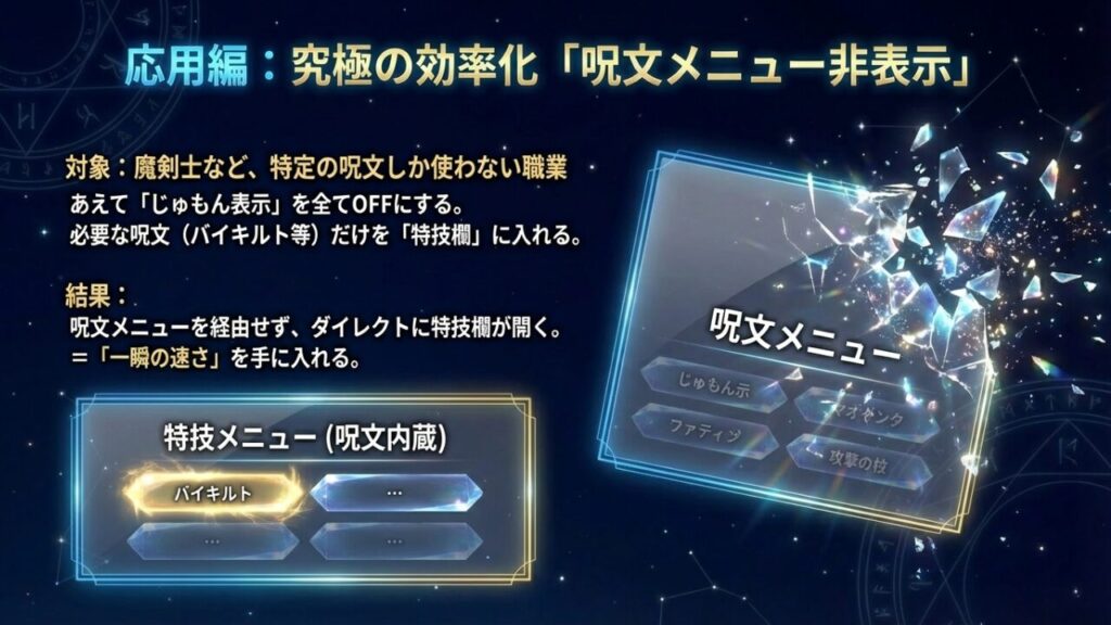 呪文をあまり多用しない職業向けのテクニックです。 あえて「呪文表示設定」をすべてオフ(非表示)にし、バイキルトなどの必要な呪文だけを特技欄にセットします。 こうすることで、呪文メニューを介さずに直接特技を選べるようになり、入力ミスが劇的に減ります!