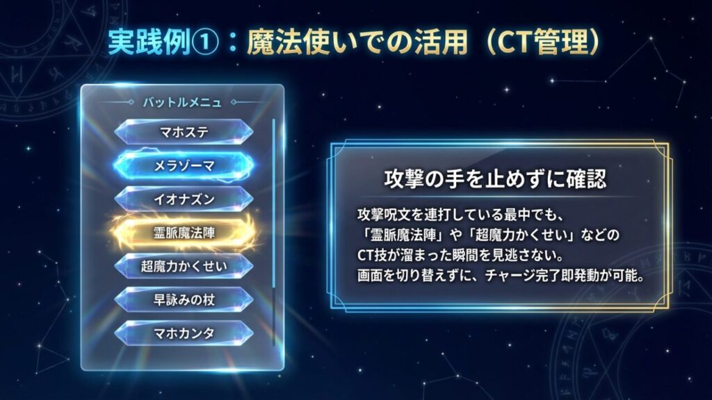 呪文を連打している最中に、「そろそろCT技が使えるかな?」と思う場面は多いですよね。 特技欄に呪文を入れておけば、メラゾーマなどの呪文を打ちながら、「霊脈魔法陣」や「超魔力かくせい」などの強力なCT特技の溜まり具合を確認でき、チャージ完了後すぐに発動できます。