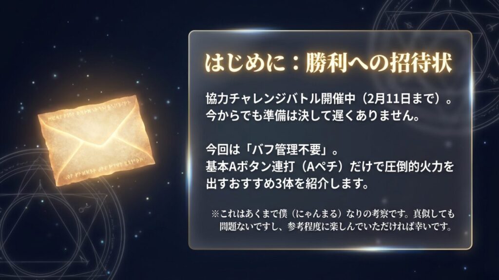 今回は、難しいバフ管理を抜きにして、基本Aボタン(決定ボタン)を連打するだけで圧倒的な火力を叩き出す、最強の「Aペチ特化モンスター」3体をご紹介します 。