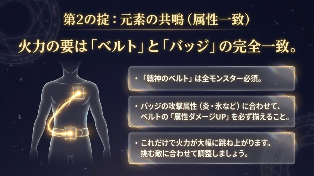 さらなる火力を求めるなら:ベルトの属性に合わせて、属性攻撃を持つ他のバッジへ変更することで、ダメージが大幅に跳ね上がります 。