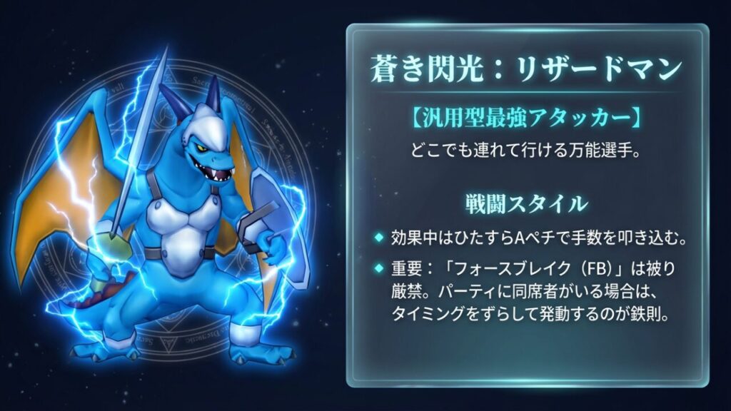 立ち回り:パーティ内に他のリザードマンがいる場合、フォースブレイク(FB)が重ならないようタイミングをずらしましょう 。