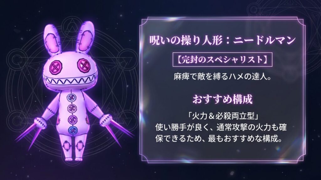 必殺技で相手を麻痺させ、敵を動かさない圧倒的な妨害性能が魅力です 。僕は使い勝手の良い「火力&必殺両立型」を推奨しています 。