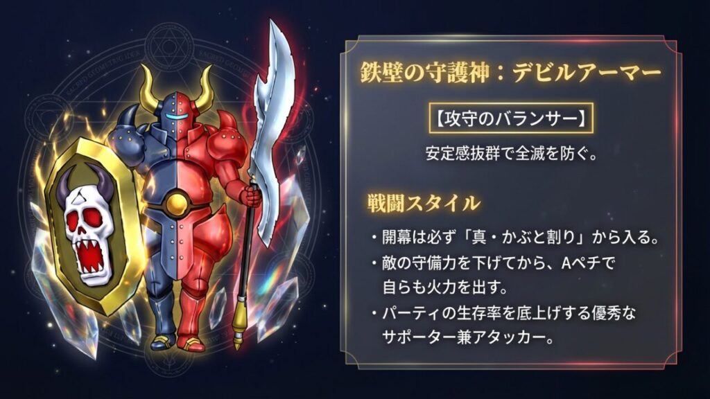 他のデビルアーマーとデバフが被らないようタイミングを見計らい、守備力を下げた後はひたすらAペチでダメージを稼ぎましょう 。